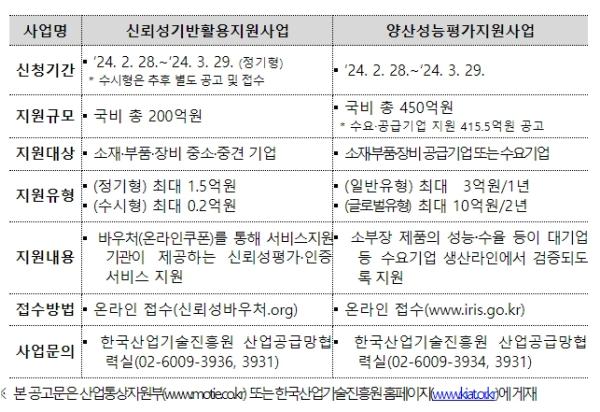 [한국쇼핑몰뉴스, 최영진기자] 소부장 기업의 신뢰성 평가 및 양산 성능평가 지원을 위한 ’24년도 사업이 본격적으로 추진된다. 산업통상자원부는 ’24년도 소부장‘신뢰성기반활용지원사업’과‘양산성능평가사업’을 산업통상자원부 및 한국산업기술진흥원(KIAT) 홈페이지에 공고하고 신청기업 지원을 받는다고 밝혔다.