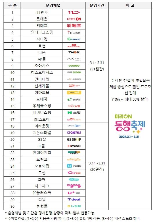 미리 온(ON) 동행축제는 ‘2024 봄빛 동행축제(5월)’에 앞서 개최하는 온라인 중심의 행사로, 입학 등 새 출발이 주로 시작되는 초봄 시즌을 겨냥한 ‘신학기 준비’, ‘봄맞이 대청소 및 집 꾸미기’ 등을 주요 컨셉으로 기획했으며, 11번가, 롯데온 등 30개 유통 플랫폼을 통해 1,700여개의 다양한 소상공인 제품들을 선보일 예정이다.