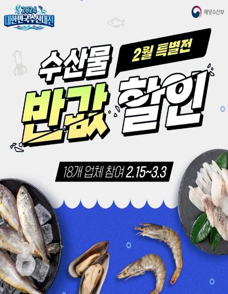 ?대한민국 수산대전-2월 특별전?은 2월 15일부터 3월 3일까지 소비자들이 마트와 온라인몰에서 국산 수산식품을 구매할 때 구매 금액의 최대 50%(정부 20%+참여 업체 20~30%)를 할인 지원하는 행사이다. 이번 행사는 명태, 참조기, 고등어, 오징어, 마른 멸치 등 물가 관리 품목과 더불어 우럭, 바다장어 등 국산 수산물을 대상으로 진행하며, 행사기간 중 필요시 정부가 유통업체와 협력하여 자체 할인율을 상향하는 등 체감물가 완화를 위해 적극적으로 대응할 계획이다.