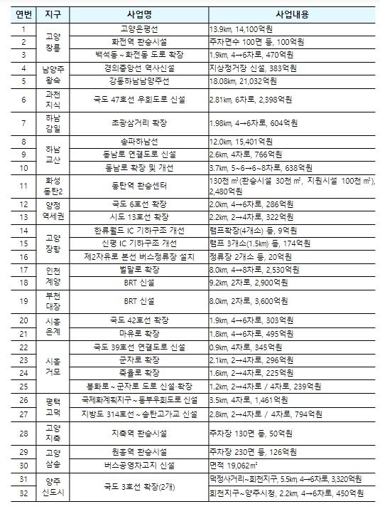 대광위는 대통령 주재로 열린 6번째 민생토론회 ?교통분야 3대 혁신전략?(1.25)에서 신도시 광역교통시설의 적기 구축을 위해 수도권 4대 권역별 집중투자사업 총 32개를 선정하는 한편, 기관 간 갈등으로 인한 사업 지연 중단을 예방하기 위해 대광위에서 갈등을 신속 조정하겠다고 발표한 바 있다.