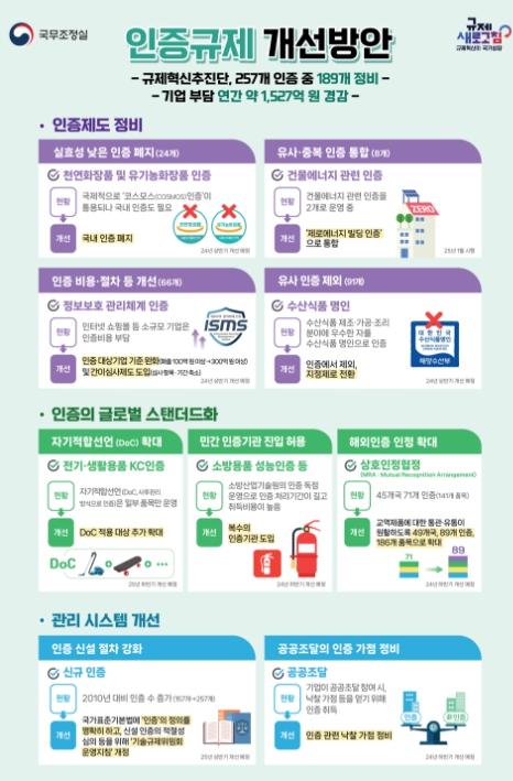 국제인증과 중복되거나 환경변화 반영에 미흡한 등 실효성이 낮은 24개 인증을 폐지하고, 유사?중복 인증을 8개로 통합했고, 절차 간소화 및 비용 절감 등 총 66개 인증을 개선했다.