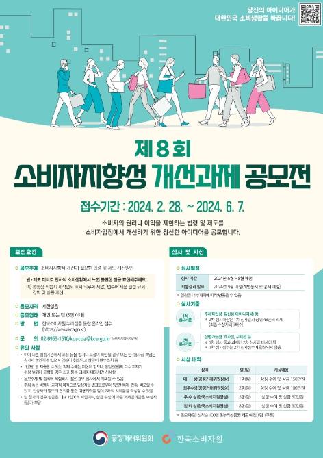 [한국쇼핑몰뉴스, 최영진기자] 공정거래위원회와 한국소비자원(원장 윤수현)은 소비생활에서 경험한 불편 사항 등에 대해 소비자의 다양한 의견과 아이디어를 듣고 이를 법·제도 개선에 반영하고자 '제8회 대국민 소비자지향성 개선과제 공모전'을 개최한다.