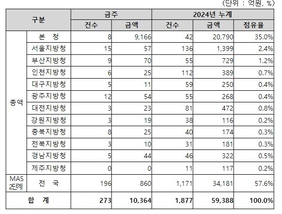 지역별 발주량을 보면, 총액계약 대상 9,504억 원 중 본청이 9,166억 원으로 96.4%를 집행하고 서울청 등 11개 지방청에서 338억 원을 각각 집행할 예정이다.