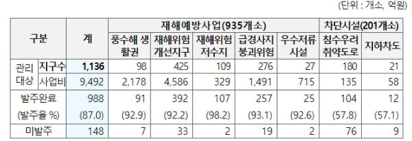 2월 말 현재, 재해예방사업 등 관리대상 1,136개소 중 988개(87.0%) 사업이 행정절차 사전 준비를 통해 조기발주를 완료한 것으로 확인됐으며, 148개(13.0%) 사업은 발주 준비 중인 것으로 나타났다.
