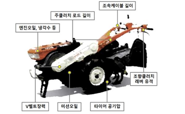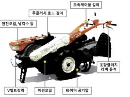 경운기= 브이(V)벨트 가운데를 손가락으로 눌러 벨트가 2~3cm 들어가면 정상이다. 이 이상 들어가면 텐션 풀리(벨트로 동력을 전달하는 장치)로 조여준다. 조속 레버의 작동 범위가 엔진 속도 범위와 일치하도록 조속 케이블 길이를 조정하고, 조향 클러치 레버는 적정 유격(1~2mm)으로 조정한다. 타이어 공기압은 양쪽 모두 108~137킬로파스칼(kPa)에 맞추고 야간반사판을 경운기 후면에 부착한다.