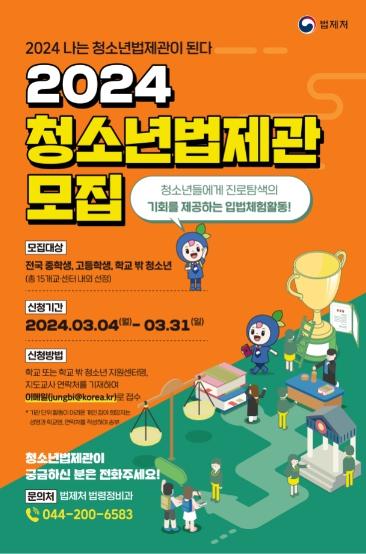 법제처는 미래세대가 법과 친해지고 준법정신을 키울 수 있도록 어린이법제관 및 청소년법제관 사업을 매년 운영하고 있다. 올해는 어린이법제관 1,300명, 15개 내외의 중ㆍ고등학교 및 학교밖청소년지원센터를 대상으로 청소년법제관 300여 명을 선정해 운영할 계획이다.