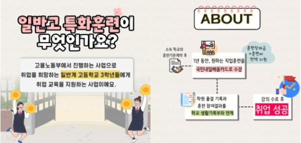 권태성 직업능력정책국장은 “일반고 특화훈련을 통해 학생들을 기업이 원하는 실무인재로 양성하고 그들의 노동시장 진입을 효과적으로 지원하고자 한다”라며 “학생들이 훈련을 통해 한 분야의 전문가로 거듭날 수 있도록 고용노동부는 지원을 아끼지 않을 계획이다”라고 말했다.