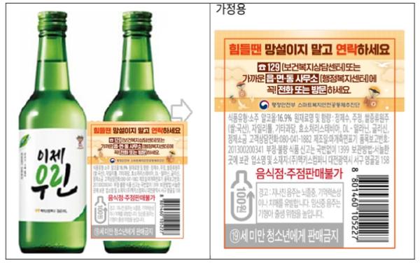 ‘이제우린’ 병 뒷면 보조라벨에는 ‘힘들땐 ☎129(보건복지상담센터) 또는 가까운 읍·면·동 사무소(행정안전복지센터)에 꼭! 전화 또는 방문하세요’라는 문구가 기재된다.