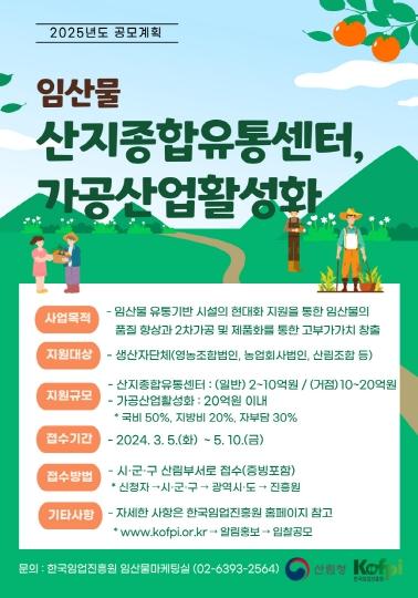 [한국쇼핑몰뉴스, 최영진기자] 산림청은 5일 단기소득임산물 시장경쟁력 향상을 위해 유통?가공분야 기반시설을 지원하는 ’25년 공모사업을 추진한다고 밝혔다.