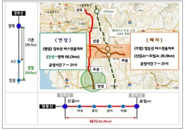 ’08년 10월 수도권 남부지역 교통 문제를 해결하기 위해 시행한 평일 경부선 버스전용차로는 최근 경기남부·세종·충청권까지 출퇴근 버스 이용 등이 증가함에 따라 확대 필요성이 제기되어 왔다.