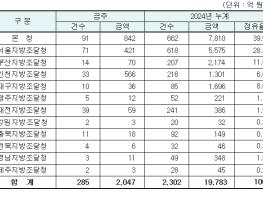 지역별 발주량을 보면 대전광역시 소재 본청 842억 원, 서울지방청 421억 원 등 2개청(1,263억 원)이 전체 금액(2,047억 원)의 61.7%를 차지하고 있으며, 인천 등 나머지 10개 지방청 784억 원이 각각 집행될 예정이다.