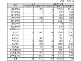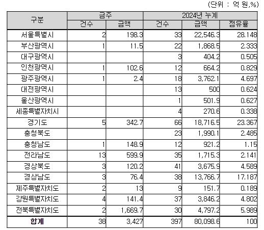 지역별로는 전북특별자치도 1,670억 원, 전라남도 600억 원, 경기도 343억 원, 그 밖의 지역이 814억 원이다.