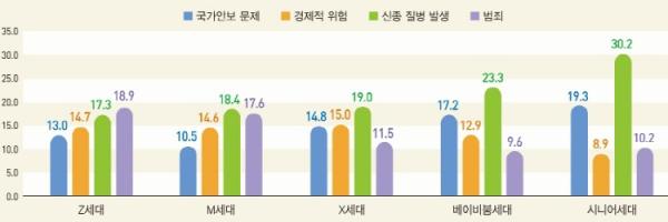 Z세대를 제외한 全 세대에서 신종 질병 발생이 우리사회의 가장 큰 불안요인으로 조사된 가운데, Z세대와 M세대는 범죄와 경제적 위험을, X세대와 베이비붐세대는 경제적 위험과 국가안보를, 시니어세대는 국가안보와 범죄를 우리 사회의 선순위 불안요인으로 인식했다.