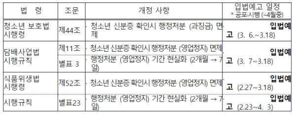 또한, 2월 15일에는 중소벤처기업부 주관 ?제1차 선량한 소상공인 보호 관계기관 협의회?를 개최해, 지자체의 행정조사 과정에서 보안용감시카메라(CCTV) 또는 다수의 진술 등을 통해 영업자가 청소년의 신분증을 확인한 사실이 객관적으로 입증되는 경우, 수사?사법 기관의 조사?판단 이전에도 행정처분을 면제할 수 있도록 하는 제도개선 및 적극행정을 추진하기로 했다.