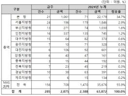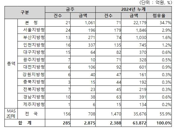 지역별 발주량을 보면, 총액계약 대상 2,167억 원 중 본청이 1,061억 원으로 49.0%를 집행하고 서울청 등 11개 지방청에서 1,106억 원을 각각 집행할 예정이다.