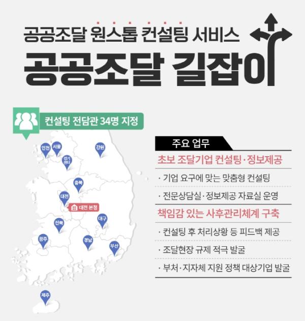 ‘공공조달 길잡이’는 공공조달에 참여하고 싶은 기업을 적극 발굴하여 조달시장 진입과 조달제도 활용에 필요한 정보를 원스톱으로 제공하는 전담관이다. 그간 초보·중소기업들이 공공조달시장 진입에 가장 어려움을 겪는 문제로 ▲ 어려운 조달제도 및 용어 ▲ 홍보 및 교육 부족 ▲ 컨설팅 창구 부재 등을 지적해 왔다. 조달청은 이를 해결하기 위해, 현장과 기업 접점에 있는 본청과 11개 지방청에 34명의 컨설팅 전담관을 지정·배치하고 방문·전화·e-mail 등 다양한 방법으로 맞춤형 1:1 컨설팅을 전담한다. 또한, 각종 기업지원 정보, 조달제도 등도 전문상담실과 조달청 홈페이지 내 공공조달 길잡이를 통해 한 곳에서 제공한다.