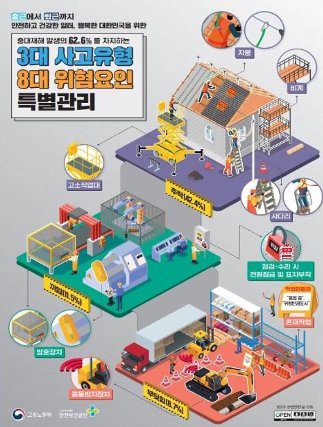 이에 고용노동부와 안전보건공단은 50억원 이상의 건설현장을 직접 방문하여 3대 사고유형 8대 위험요인 등을 집중점검한다. 아울러, 건설현장 사망사고의 주요 원인인 굴착기, 덤프트럭 등 건설 기계?장비 관련 안전조치 등을 집중적으로 살펴보면서, 현장의 안전관리에 실질적인 도움이 될 수 있도록 위험 기계·장비 표준작업계획서를 개정하여 배포한다.