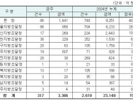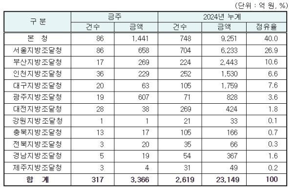 지역별 발주량을 보면 대전광역시 소재 본청 1,441억 원, 서울지방청 658억 원 등 2개청(2,099억 원)이 전체 금액(3,366억 원)의 62.4%를 차지하고 있으며, 인천 등 나머지 10개 지방청 1,267억 원이 각각 집행될 예정이다.