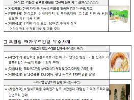 이자 부담을 줄이고 싶거나 담보부족, 낮은 신용등급, 대출한도 초과 등으로 자금조달이 어려운 소상공인에게 민간자금 유치를 지원하기 위해 대출형 1,350개사, 후원형 400개사, 증권형 50개사 등 총 1,800여개사를 6개 주관기관을 통해 지원할 계획이다.