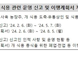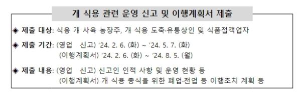 전·폐업 등을 위한 정부 지원을 받기 위해서는 법에서 정한 기간 내 신고 및 이행계획서 제출이 필수이므로 현재 개 식용을 목적으로 운영 중인 개사육농장주, 개식용 도축·유통상인 및 식품접객업자는 5월 7일까지 운영 현황 등을 신고하고, 8월 5일까지 전·폐업 등에 관한 종식 이행계획서를 시·군·구에 제출하여야 한다.