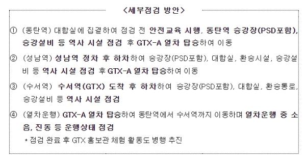 이번 ‘국민참여 안전점검’에서는 일반 국민에게 최초로 공개되는 GTX 수서역사, GTX 성남역사 등 준공역사의 시설을 점검한다. GTX-A 철도차량 시승체험 활동 등 이용객의 안전과 편의사항 점검도 중점 실시한다.