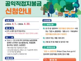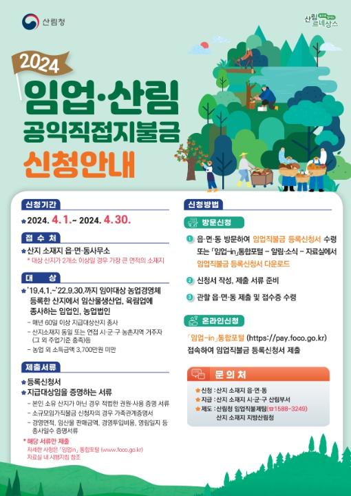남부지방산림청(청장 최영태)은 2024년 임업·산림 공익직접지불금 신청·접수를 4월 1일부터 4월 30일까지 진행한다고 밝혔다.