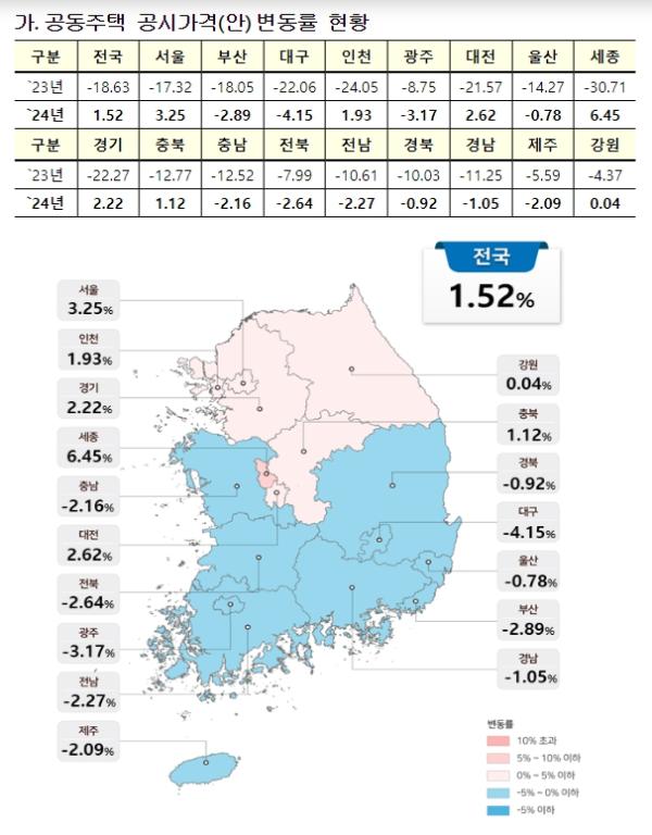 또한, 전반적인 시세 변동이 크지 않은 가운데 ‘24년 현실화율도 동결되어 시ㆍ도별 공시가격은 지역별 부동산 시장상황에 따른 상승?하락은 있으나, 전반적인 변동폭은 크지 않은 것으로 나타났다.
