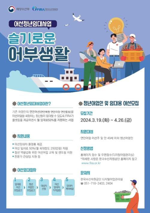 [한국쇼핑몰뉴스, 최영진기자] 해양수산부는 2024년 어선청년임대사업을 통해 지원받을 청년어업인을 3월 19일부터 4월 26일까지 모집한다.