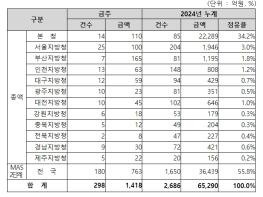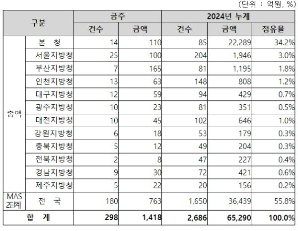 지역별 발주량을 보면, 총액계약 대상 655억 원 중 본청이 110억 원으로 16.8%를 집행하고 서울청 등 11개 지방청에서 545억 원을 각각 집행할 예정이다.