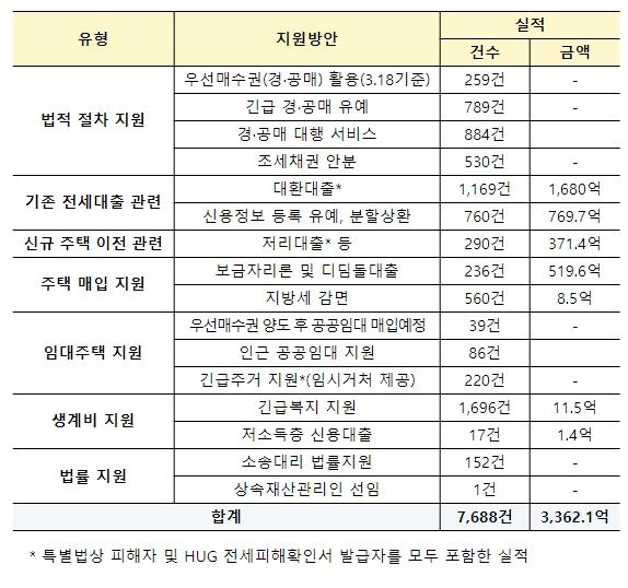 그간 위원회에서 최종 의결한 전세사기피해자등 가결 건은 총 14,001건(누계),긴급 경?공매 유예 협조요청 가결 건은 총 795건(누계)으로, 결정된 피해자등에게는 주거, 금융, 법적 절차 등 총 7,688건(누계)을 지원하고 있다.