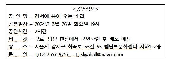 그 첫 번째 기획공연인 [강서에 봄이 오는 소리]가 오는 3월 26일 스카이아트홀에서 열린다.