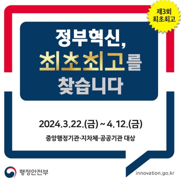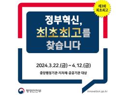 [한국쇼핑몰뉴스, 최영진기자] 행정안전부는 한국행정연구원과 함께 오는 4월 12일까지 중앙·지방 행정기관 및 공공기관을 대상으로 공모를 통해 제3회 ‘정부혁신 최초?최고’ 선정을 추진한다.
