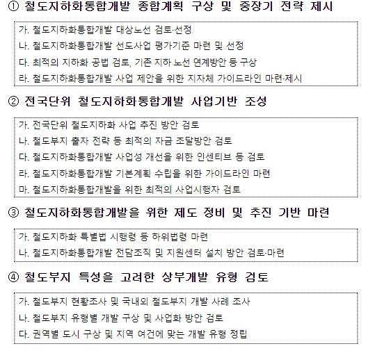 이번 연구 용역에서는 국내 철도부지 현황 및 국내외 철도 지하화 사례조사, 대상노선 선정을 위한 평가 기준을 마련하고, 최적의 지하화 공법과 지역 여건에 맞는 도시개발 방향 등도 검토할 예정이다.