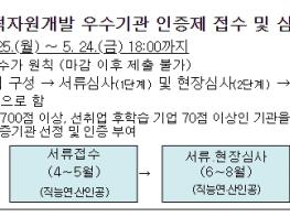 인적자원개발이 우수한 기관을 발굴·격려하여 공공 및 민간기관의 인적자원개발을 촉진하기 위해 2006년부터 선정하고 있다. 인적자원개발 우수기관으로 인증을 받으려는 기업과 기관은 3월 25일(월)부터 5월 24일(금)까지 민간 부분은 한국산업인력공단에, 공공 부분은 한국직업능력연구원에 신청할 수 있다.