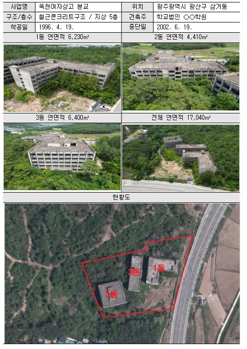 국민권익위의 조사 결과, ㄱ학교법인은 1996년 광주광역시 교육청으로부터 학교시설사업을 허가받아 광주광역시 광산구에 건축물 3개동을 짓던 중 골조공사까지 완료된 상태에서 2002년 학교시설사업 및 건축허가가 취소됐고, 건축물은 그 상태로 현재까지 방치됐다.