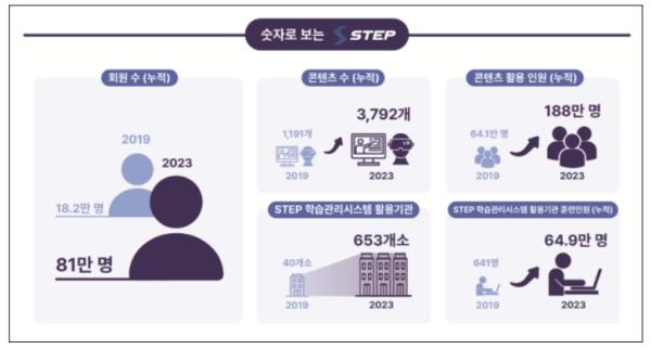 스텝은 2019년 10월 개통 이후 81만 명의 누적 회원 수를 보유하고 있다. 이러닝 1,755개, 가상훈련 144개, 메타버스 6개 등 1900여개와 더불어 오픈마켓 과정 등 총 3,792개의 콘텐츠를 보유하고 있으며, 온라인 훈련 인원수는 이러닝 148만 명, 가상훈련 20만여 명, 학습관리시스템(LMS) 활용 콘텐츠 20만여 명 등 총 188만 명에 이른다.