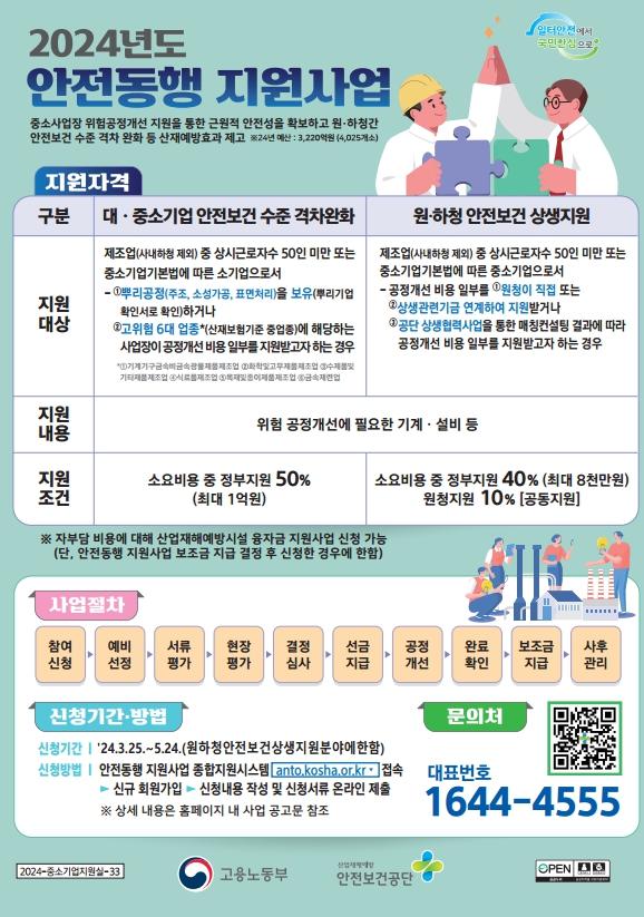 고용노동부와 안전보건공단(이사장 안종주)이 시행하는 안전동행 지원사업(‘24년 4,000여 개소 지원, 3,220억원)은 상시근로자 50명 미만 제조업 사업장 등이 기계?설비로부터의 재해 위험을 근원적으로 줄이기 위한 공정개선을 하고자 하는 경우 소요 비용(비용의 40%~50%, 최대 1억원)을 지원받을 수 있는 사업이다.