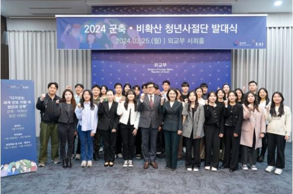 [한국쇼핑몰뉴스, 최영진기자] 외교부가 주최하고 동아시아연구원(EAI)이 주관하는 '2024 군축·비확산 청년사절단' 발대식이 3월 25일 외교부 18층 서희홀에서 개최됐다. 외교부는 국내외 대학(원)생 31명을 청년사절로 임명했다. 청년사절단은 선서를 통해 성실하고 책임 있는 자세로 활동에 임하겠다는 각오를 다졌다.