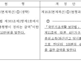이번 개정안은 파산재단 또는 개인회생재단으로부터 제외할 수 있는 6월간의 생계비 상한을 정액(1,110만 원)에서 정률로 개정하는 내용이다.