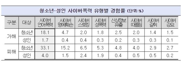 사이버폭력의 가·피해 경험은 청소년·성인 모두 남성, 청소년은 중학생, 성인은 20대가 높았고, 청소년은 온라인 게임(48.3%), 성인은 문자 및 인스턴트 메시지(64.2%)를 통해 가장 많은 사이버폭력을 행사했다. 특히 청소년과 성인 모두 메타버스 상에서의 사이버폭력 가해 경험이 전년 대비 증가(청소년: 1.6%→1.9%, 성인: 0.8%→3.5%)한 것으로 나타났다.