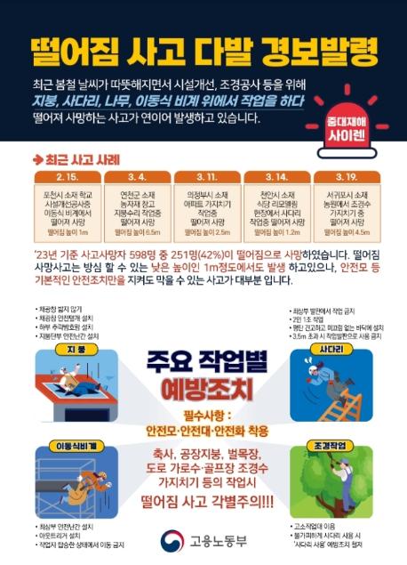 고용노동부는 ‘중대재해 사이렌’으로 ‘떨어짐 사망사고 위기경보’를 발령하여 사업장에 각별히 주의할 것을 요청하는 한편, ‘산업안전 대진단’에 참여하여 마치 건강검진을 받는 것처럼 일터의 안전수준을 진단해 볼 것을 촉구했다.