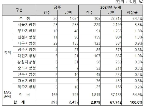 지역별 발주량을 보면, 총액계약 대상 1,703억 원 중 본청이 1,024억 원으로 60.1%를 집행하고 서울청 등 11개 지방청에서 679억 원을 각각 집행할 예정이다.