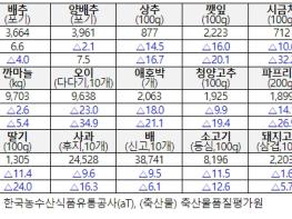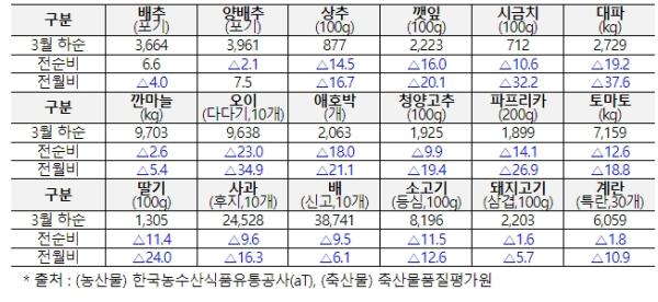 농식품부는 3월 들어 정부의 비축 물량 방출, 할당관세 물량 공급 확대, 납품단가 지원 및 할인지원 확대 등 긴급 가격안정대책 추진으로 3월 하순 주요 농축산물의 소비자가격은 전월 대비 사과 16.3%, 대파 37.6% 하락하는 등 전반적으로 하향세를 보이고 있다고 밝혔다.