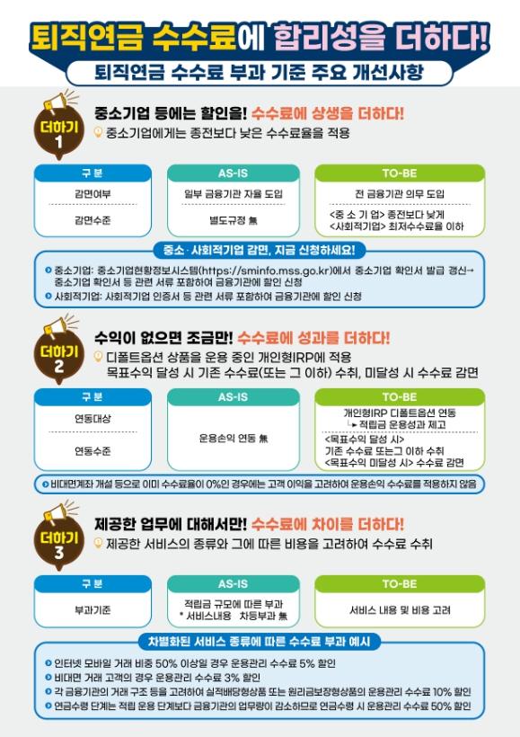 앞으로 정부는 금융기관과 함께 변화되는 수수료 체계에 대한 대국민 안내, 퇴직연금 가입자 교육 등 집중 홍보 기간을 운영하는 한편 금융기관별 수수료율을 더 쉽게 비교할 수 있도록 제도를 개선할 예정이다.