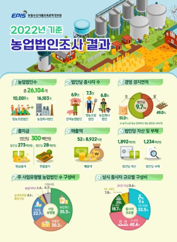 [한국쇼핑몰뉴스, 최영진기자] 농림축산식품부는 '2022년 기준 농업법인조사' 결과를 발표하면서, 농업법인 수는 26,104개로 집계됐고 농업법인 총매출액은 52조 8,922억원으로 ‘21년 대비 7.6% 성장했다고 밝혔다.