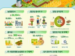 농업법인 총매출액은 52조 8,922억원으로 전년 대비 7.6% 증가했다. 영농조합법인 매출액은 13조 6,052억원으로 전년 대비 1.4% 감소했고, 농업회사법인 매출액은 39조 2,870억원으로 전년 대비 11.2% 증가했다.