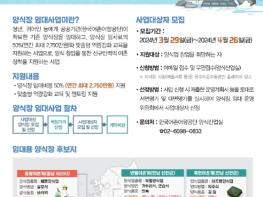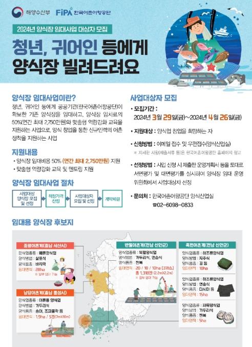 양식장 임대사업은 청년, 귀어인 등에게 공공기관(한국어촌어항공단)이 확보한 기존 양식장을 임대하고 양식장 임차료의 50%(연간 최대 2,750만 원)와 맞춤형 역량강화 교육을 지원하는 사업으로, 청년과 귀어인 등 신규인력이 양식 창업을 통해 어촌에 정착할 수 있도록 지원하고자 올해 처음 시작된다.