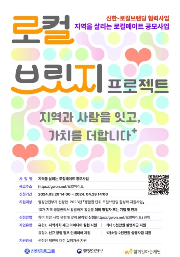 [한국쇼핑몰뉴스, 최영진기자] 행정안전부는 3월 29일부터 신한금융지주회사(회장 진옥동, 이하 ‘신한금융’)와 '로컬브랜딩 사업을 통한 지역경제 활성화 협력사업, 로컬브릿지 프로젝트'에 착수한다고 밝혔다.