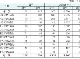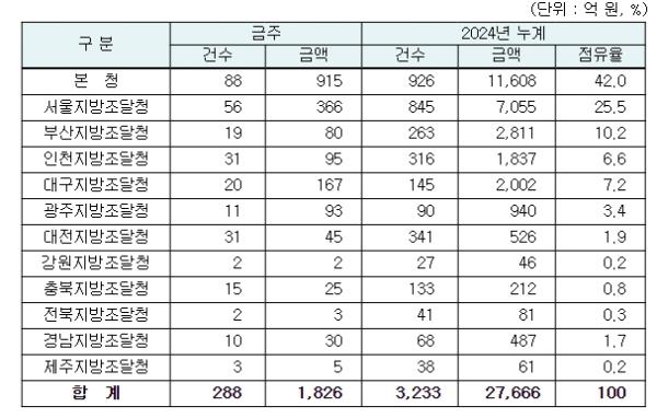 지역별 발주량을 보면 대전광역시 소재 본청 915억 원, 서울지방청 366억 원 등 2개청(1,281억 원)이 전체 금액(1,826억 원)의 70.2%를 차지하고 있으며, 인천 등 나머지 10개 지방청 545억 원이 각각 집행될 예정이다.