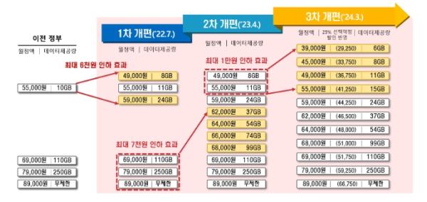 이번 정부 들어 고가 중심 5G 요금제를 중저가 중심으로 개편하는 한편 이용자가 실제 쓰는 만큼 요금을 낼 수 있도록 데이터 제공량을 세분화(’22.7월, ’23.4월, ’24.3월)했으며, 다양한 이용패턴을 반영하여 가격은 저렴하고 혜택이 강화된 청년ㆍ고령층ㆍ알뜰폰ㆍ온라인 요금제를 신설(’23.4월)했다.